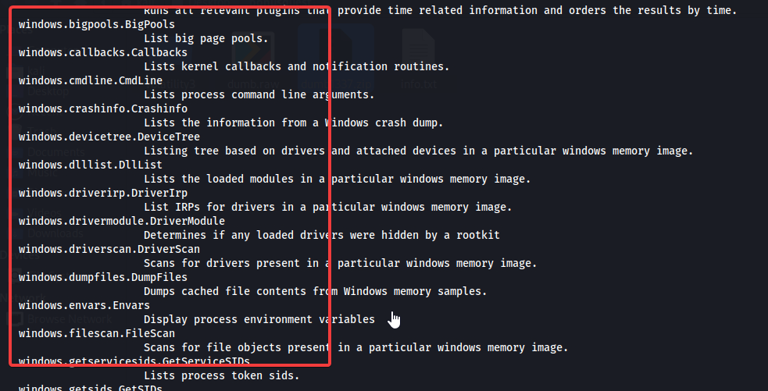 Start the tool and let’s check out the help page to see what we can work with. Since we know this is a windows dump file, we will just focus on the windows plugins.