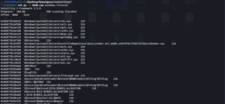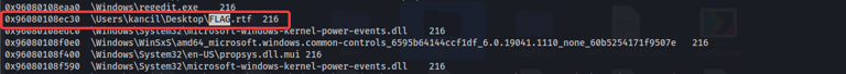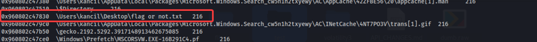 Considering that we would have to somehow find a flag, the flag text might be placed in a file. So, let’s first scan for files by using the** windows.filescan** plugin. The plugin lists all the files that are in the memory dump.