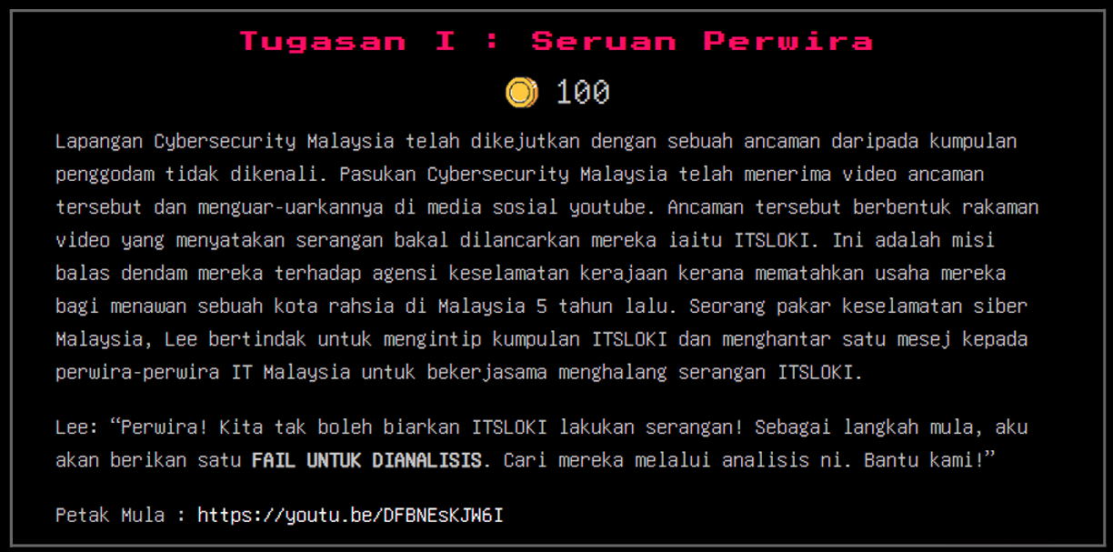 It seems like a local hacker group called ITSLOKI has been threatening Malaysia’s cybersecurity landscape, their motivations is mainly about revenge as their efforts have been stopped by the government before. Lee, working as a spy sends us a link saying that we must analyze a certain file in that link. Let’s open it right away…