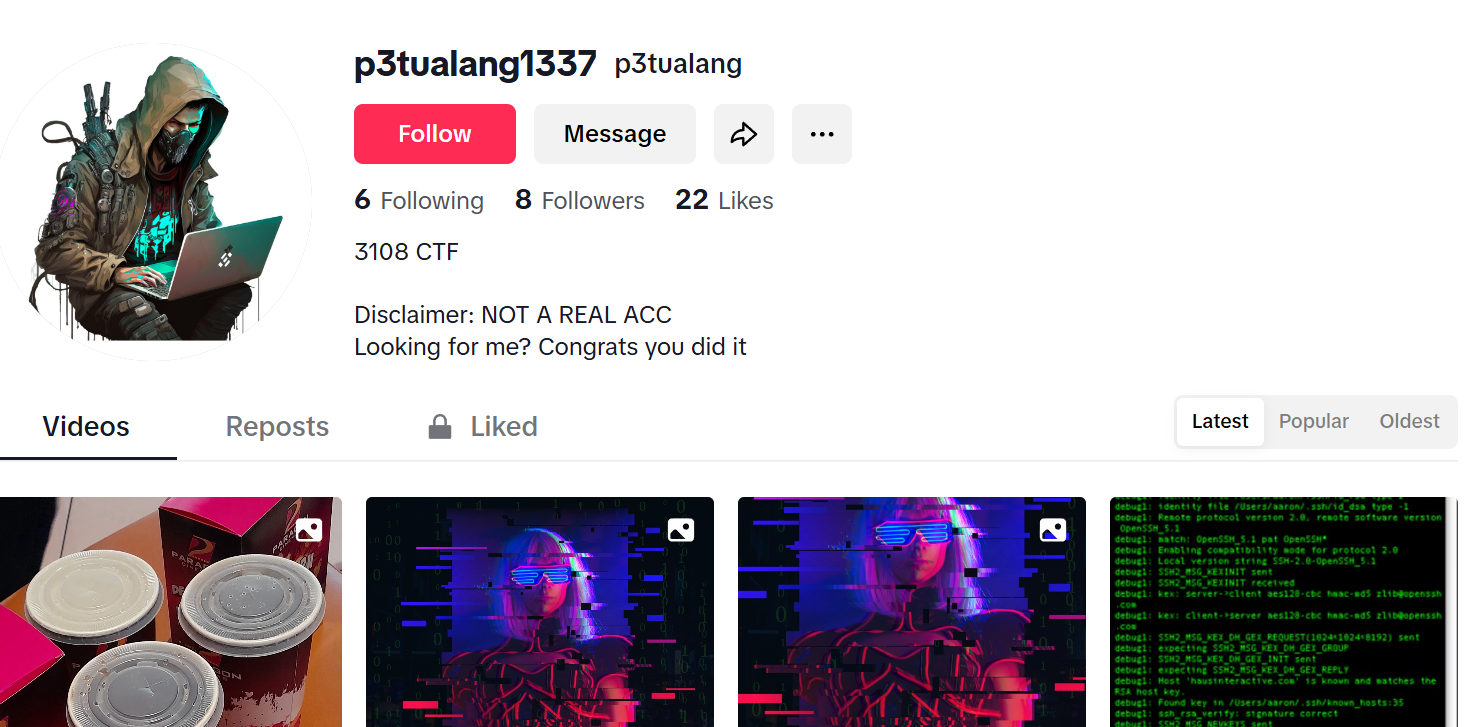 After doing some OSINT, we find this account @p3tualang on TikTok. After checking out all the videos one by one, we find that there is a discord link in one of the posts. Let’s enter their server to investigate further.