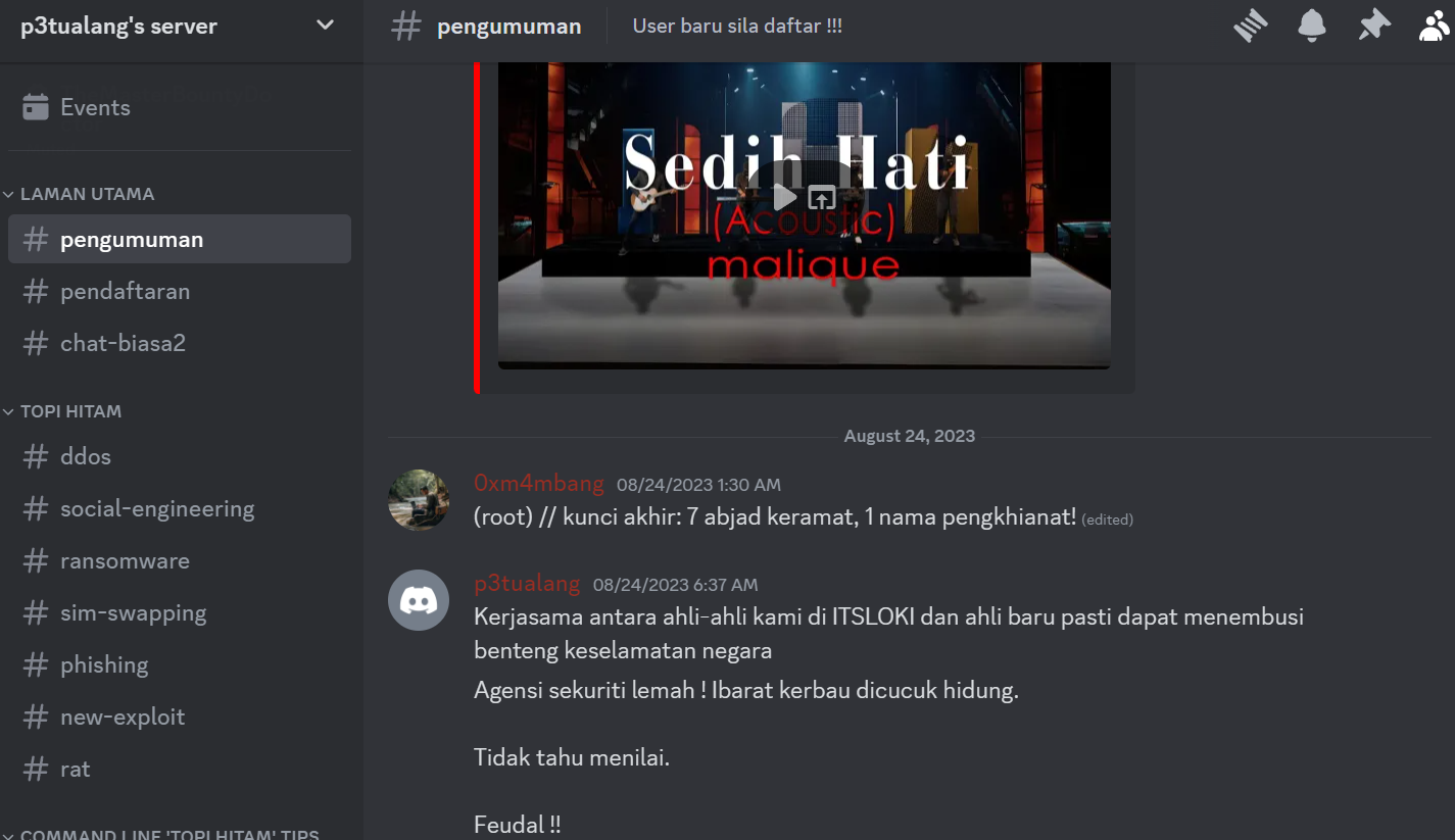 After examining all the channels, we noticed what appears to be a hidden message within the “TOPI HITAM” channel category