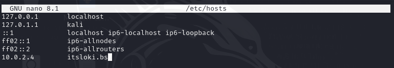 itsloki.bs seems to be the original domain name for the server. Now we just need to insert this into our hosts file located at /etc/hosts