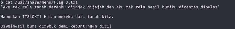 We have found the final flag! The flag is 3108{h4sil_bum!_d1r0b3k_dem1_kep3nt!ng4n_d1r1}